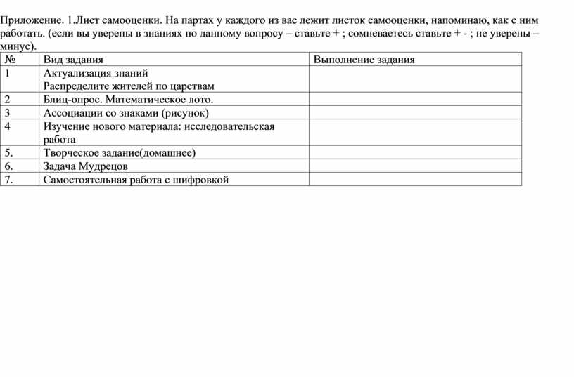 Приложение. 1.Лист самооценки. На партах у каждого из вас лежит листок самооценки, напоминаю, как с ним работать. (если вы уверены в знаниях по данному вопросу – ставьте + ; сомневаетесь ставьте + - ; не уверены – минус).
