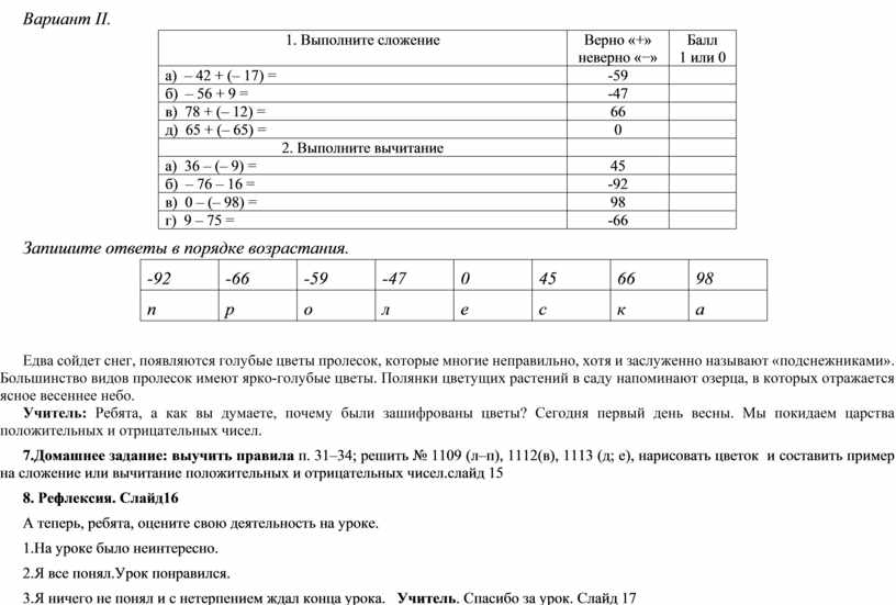 Учитель: Ребята, а как вы думаете, почему были зашифрованы цветы? Сегодня первый день весны. Мы покидаем царства положительных и отрицательных чисел.