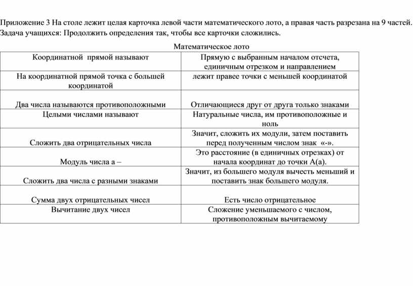 Приложение 3 На столе лежит целая карточка левой части математического лото, а правая часть разрезана на 9 частей. Задача учащихся: Продолжить определения так, чтобы все карточки сложились.
