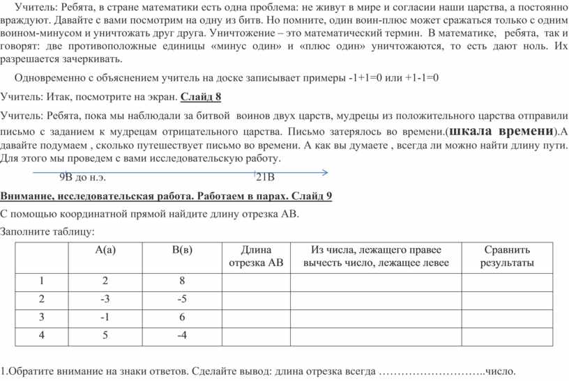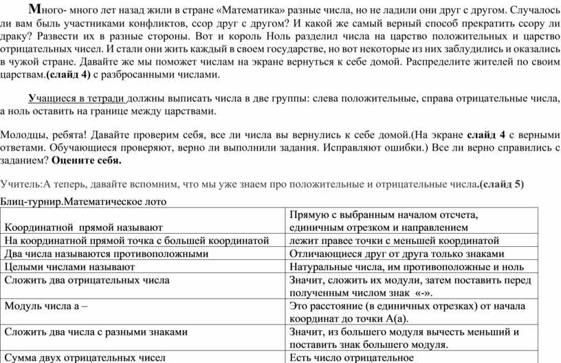 Много- много лет назад жили в стране «Математика» разные числа, но не ладили они друг с другом. Случалось ли вам быль участниками конфликтов, ссор друг с другом? И какой же самый верный способ прекратить ссору ли драку? Развести их в разные стороны. Вот и король Ноль разделил числа на царство положительных и царство отрицательных чисел. И стали они жить каждый в своем государстве, но вот некоторые из них заблудились и оказались в чужой стране. Давайте же мы поможет числам на экране вернуться к себе домой. Распределите жителей по своим царствам.(слайд 4) с разбросанными числами.