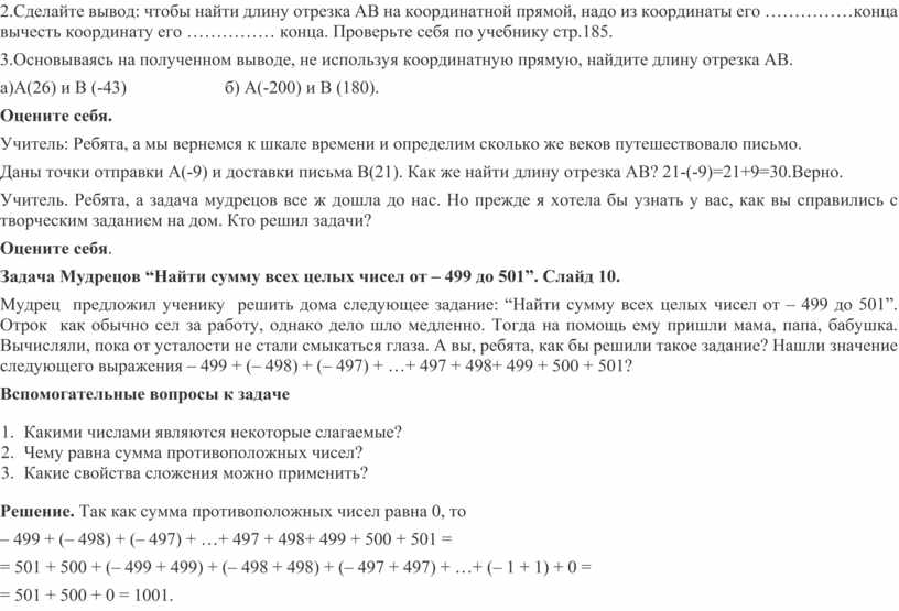 Мудрец предложил ученику решить дома следующее задание: “Найти сумму всех целых чисел от – 499 до 501”. Отрок как обычно сел за работу, однако дело шло медленно. Тогда на помощь ему пришли мама, папа, бабушка. Вычисляли, пока от усталости не стали смыкаться глаза. А вы, ребята, как бы решили такое задание? Нашли значение следующего выражения – 499 + (– 498) + (– 497) + …+ 497 + 498+ 499 + 500 + 501?