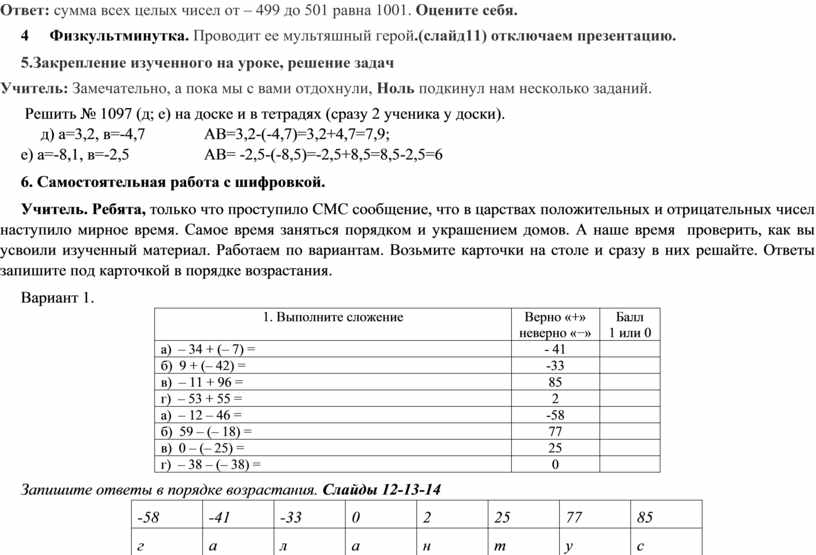 Ответ: сумма всех целых чисел от – 499 до 501 равна 1001. Оцените себя.