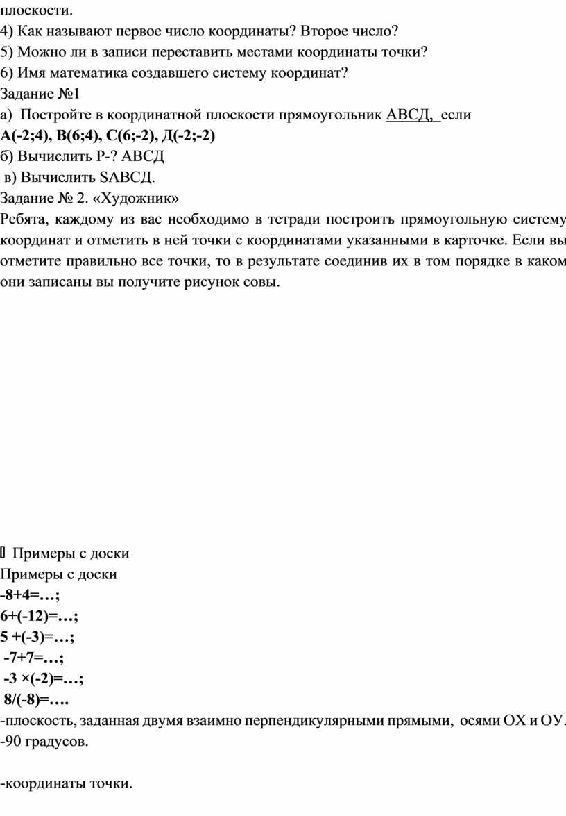 2) Под каким углом пересекаются координатные прямые? 3) Как называются числа, задающиеся положение точки на координатной плоскости. 4) Как называют первое число координаты? Второе число? 5) Можно ли в записи переставить местами координаты точки? 6) Имя математика создавшего систему координат? Задание №1 а) Постройте в координатной плоскости прямоугольник АВСД, если А(-2;4), В(6;4), С(6;-2), Д(-2;-2) б) Вычислить Р-? АВСД в) Вычислить SАВСД. Задание № 2. «Художник» Ребята, каждому из вас необходимо в тетради построить прямоугольную систему координат и отметить в ней точки с координатами указанными в карточке. Если вы отметите правильно все точки, то в результате соединив их в том порядке в каком они записаны вы получите рисунок совы.
