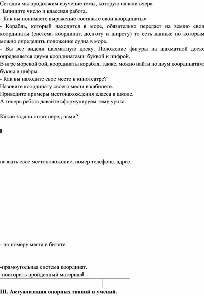Сегодня мы продолжим изучение темы, которую начали вчера. Запишите число и классная работа. - Как вы понимаете выражение «оставьте свои координаты» - Корабль, который находится в море, обязательно передает на землю свои координаты (система координат, долготу и широту) то есть данные по которым можно определить положение судна в море. - Вы все видели шахматную доску. Положение фигуры на шахматной доске определяется двумя координатами: буквой и цифрой. В игре морской бой, координаты корабля, также, можно найти по двум координатам: буквы и цифры. - Как вы находите свое место в кинотеатре? Назовите координату своего места в кабинете. Приведите примеры местонахождения класса в школе. А теперь ребята давайте сформулируем тему урока.