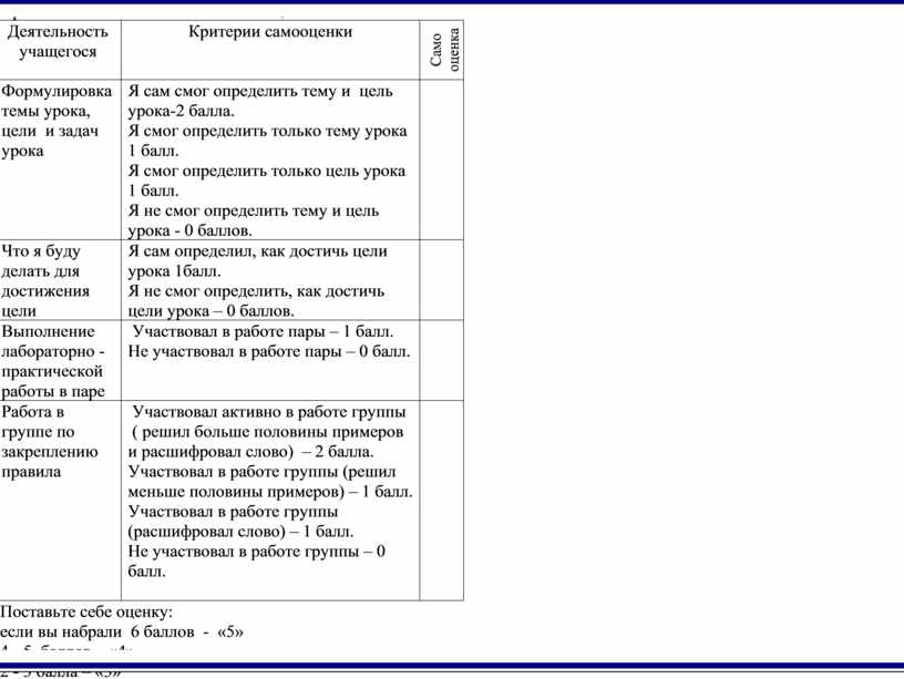 Я сам смог определить тему и цель урока-2 балла. Я смог определить только тему урока 1 балл. Я смог определить только цель урока 1 балл. Я не смог определить тему и цель урока - 0 баллов. |