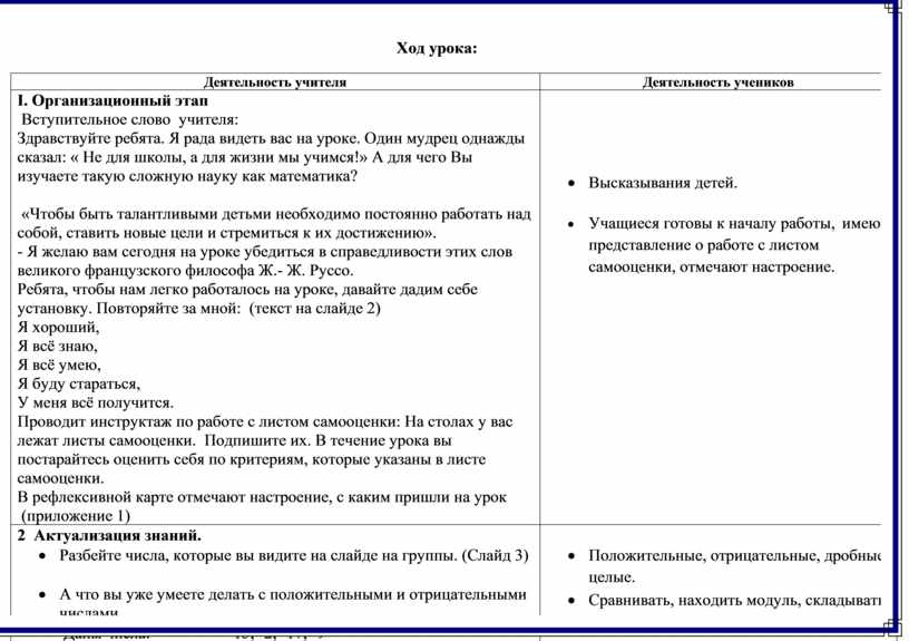 «Чтобы быть талантливыми детьми необходимо постоянно работать над собой, ставить новые цели и стремиться к их достижению». - Я желаю вам сегодня на уроке убедиться в справедливости этих слов великого французского философа Ж.- Ж. Руссо. Ребята, чтобы нам легко работалось на уроке, давайте дадим себе установку. Повторяйте за мной: (текст на слайде 2) Я хороший, Я всё знаю, Я всё умею, Я буду стараться, У меня всё получится. Проводит инструктаж по работе с листом самооценки: На столах у вас лежат листы самооценки. Подпишите их. В течение урока вы постарайтесь оценить себя по критериям, которые указаны в листе самооценки. В рефлексивной карте отмечают настроение, с каким пришли на урок (приложение 1) |