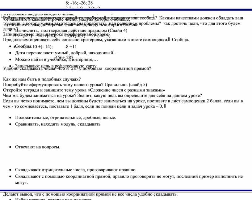 Делают вывод, что с помощью координатной прямой не все числа удобно складывать. · Найти правило, которое нам поможет. · формулируют тему.