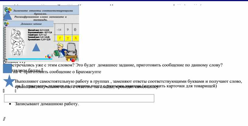 Участвовал активно в работе группы ( решил больше половины примеров и расшифровал слово) – 2 балла. Участвовал в работе группы (решил меньше половины примеров) – 1 балл. Участвовал в работе группы (расшифровал слово) – 1 балл. Не участвовал в работе группы – 0 балл.