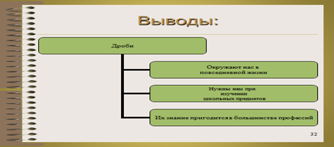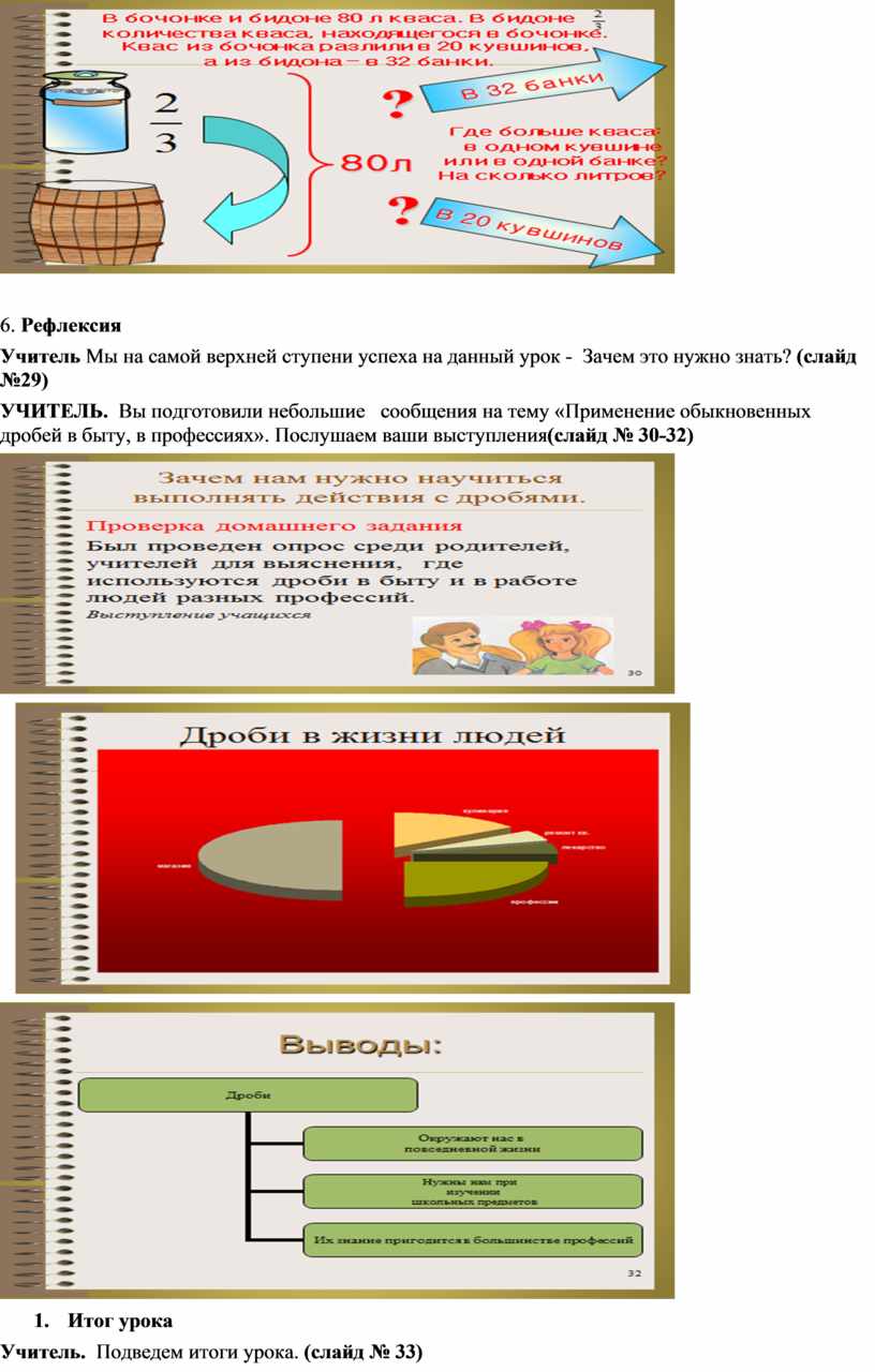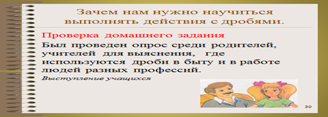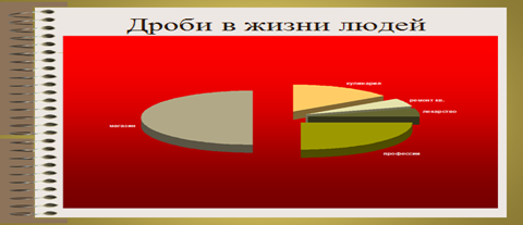 УЧИТЕЛЬ. Вы подготовили небольшие сообщения на тему «Применение обыкновенных дробей в быту, в профессиях». Послушаем ваши выступления(слайд № 30-32)