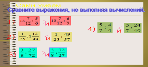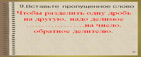 1. Создать условия для обобщения и систематизации знаний по теме; отработки навыков выполнять деление дробей; совместные действия с дробями;