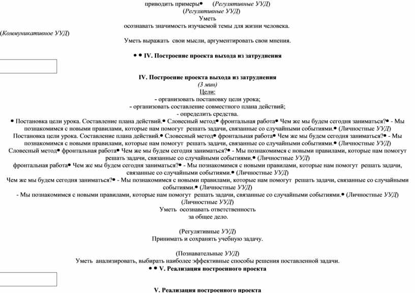 V. Реализация построенного проекта (10 мин) Цели: - реализовать построенный проект в соответствии с планом; - зафиксировать новое знание в речи и знаках; - организовать устранение и фиксирование преодоления затруднения.