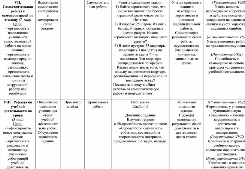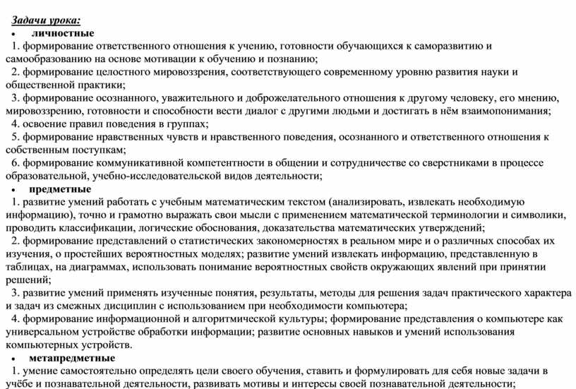 (Познавательные УУД) Воспринимать и критически анализировать информацию, представленную в различных формах, понимать вероятностный характер многих реальных зависимостей, производить простейшие вероятностные расчеты. (Регулятивные УУД) Принимать и сохранять учебную задачу; адекватно оценивать свои достижения. (Коммуникативные УУД) Участвовать в диалоге, выполняя принятые правила