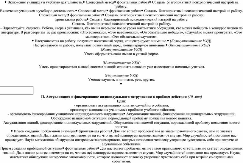 II. Актуализация и фиксирование индивидуального затруднения в пробном действии (10 мин) Цели: - организовать актуализацию понятия случайного события; - организует выполнение учащимися пробного учебного действия; - организовать фиксирования учащимися индивидуального затруднения |