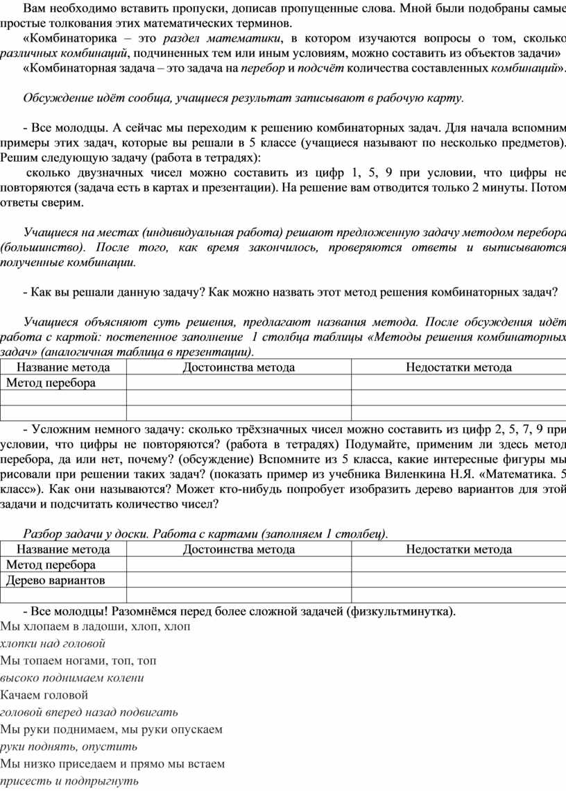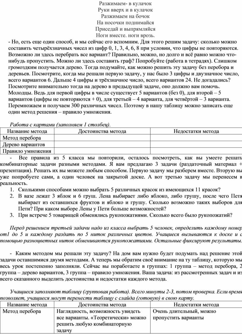 Учащиеся объясняют суть решения, предлагают названия метода. После обсуждения идёт работа с картой: постепенное заполнение 1 столбца таблицы «Методы решения комбинаторных задач» (аналогичная таблица в презентации).