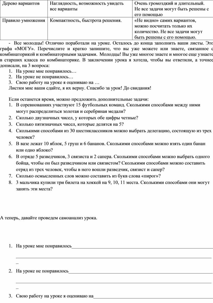 - Все молодцы! Отлично поработали на уроке. Осталось до конца заполнить ваши листы. Это графа «МОГУ». Перечислите и кратко запишите, что вы уже можете или знаете, связанное с комбинаторикой и комбинаторными задачами. Молодцы! Вы уже многое знаете и многое еще узнаете в старших класса по комбинаторике. В заключении урока я хотела, чтобы вы ответили, а точнее дописали, на 3 вопроса: