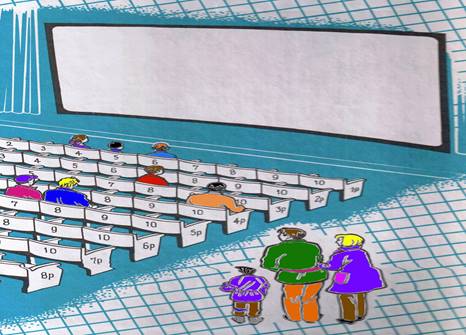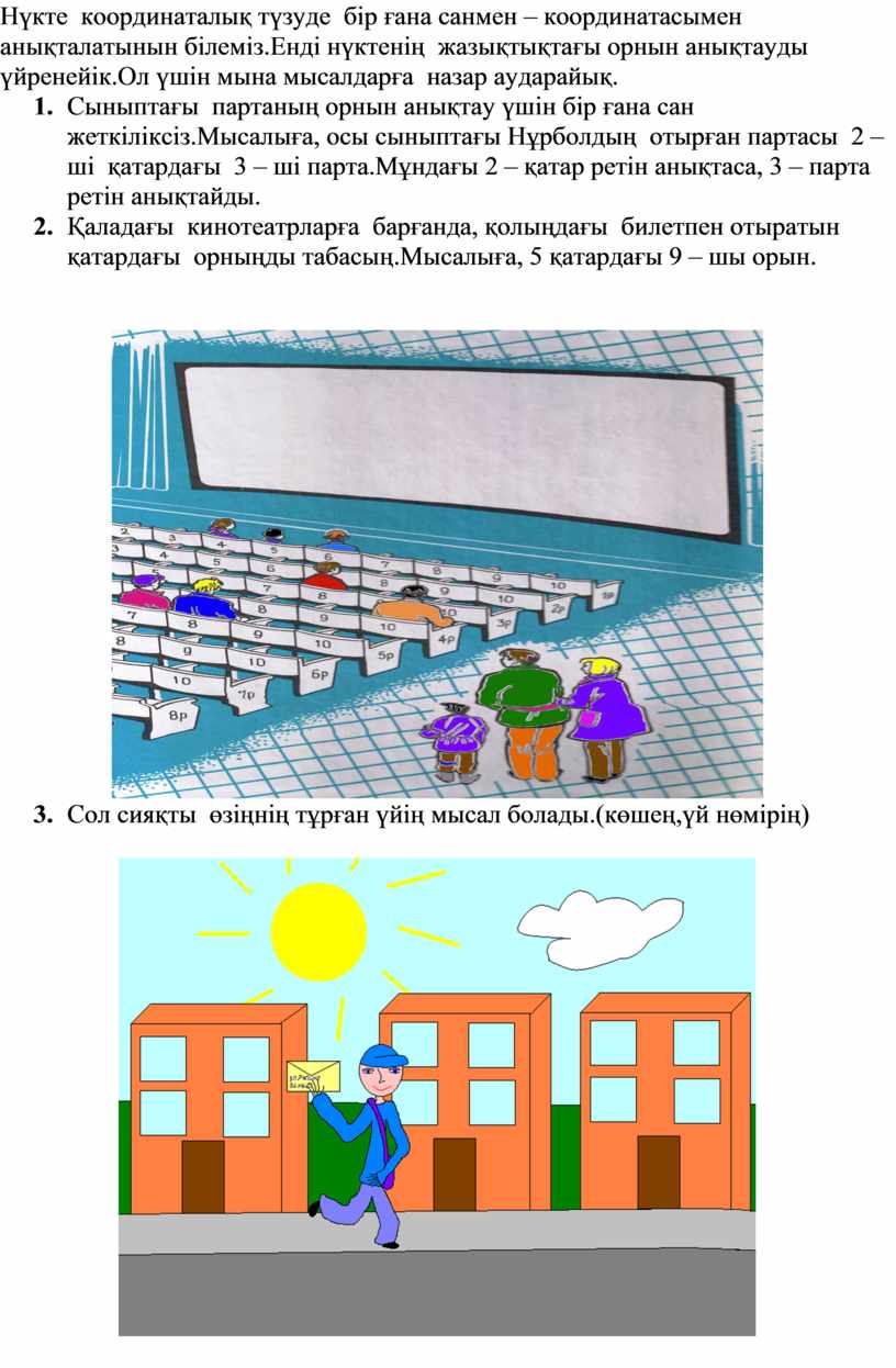 2. Қаладағы кинотеатрларға барғанда, қолыңдағы билетпен отыратын қатардағы орныңды табасың.Мысалыға, 5 қатардағы 9 – шы орын.