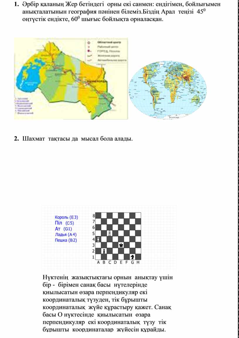 4. Әрбір қаланың Жер бетіндегі орны екі санмен: ендігімен, бойлығымен анықталатынын география пәнінен білеміз.Біздің Арал теңізі 450 оңтүстік ендікте, 600 шығыс бойлықта орналасқан.