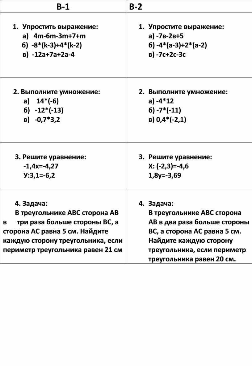 1. Упростите выражение: а) -7в-2в+5 б) -4*(а-3)+2*(а-2) в) -7с+2с-3с |