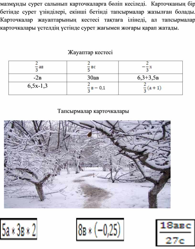 Жауаптары жазылған кесте дайындалып тақтаға ілінеді,ал тапсырмалар карточкаларын тұтас параққа дайындап ,сыртына белгілі бір мазмұнды сурет салынып карточкаларға бөліп кесіледі. Карточканың бір бетінде сурет үзінділері, екінші бетінді тапсырмалар жазылған болады. Карточкалар жауаптарының кестесі тақтаға ілінеді, ал тапсырмалар карточкалары үстелдің үстінде сурет жағымен жоғары қарап жатады.