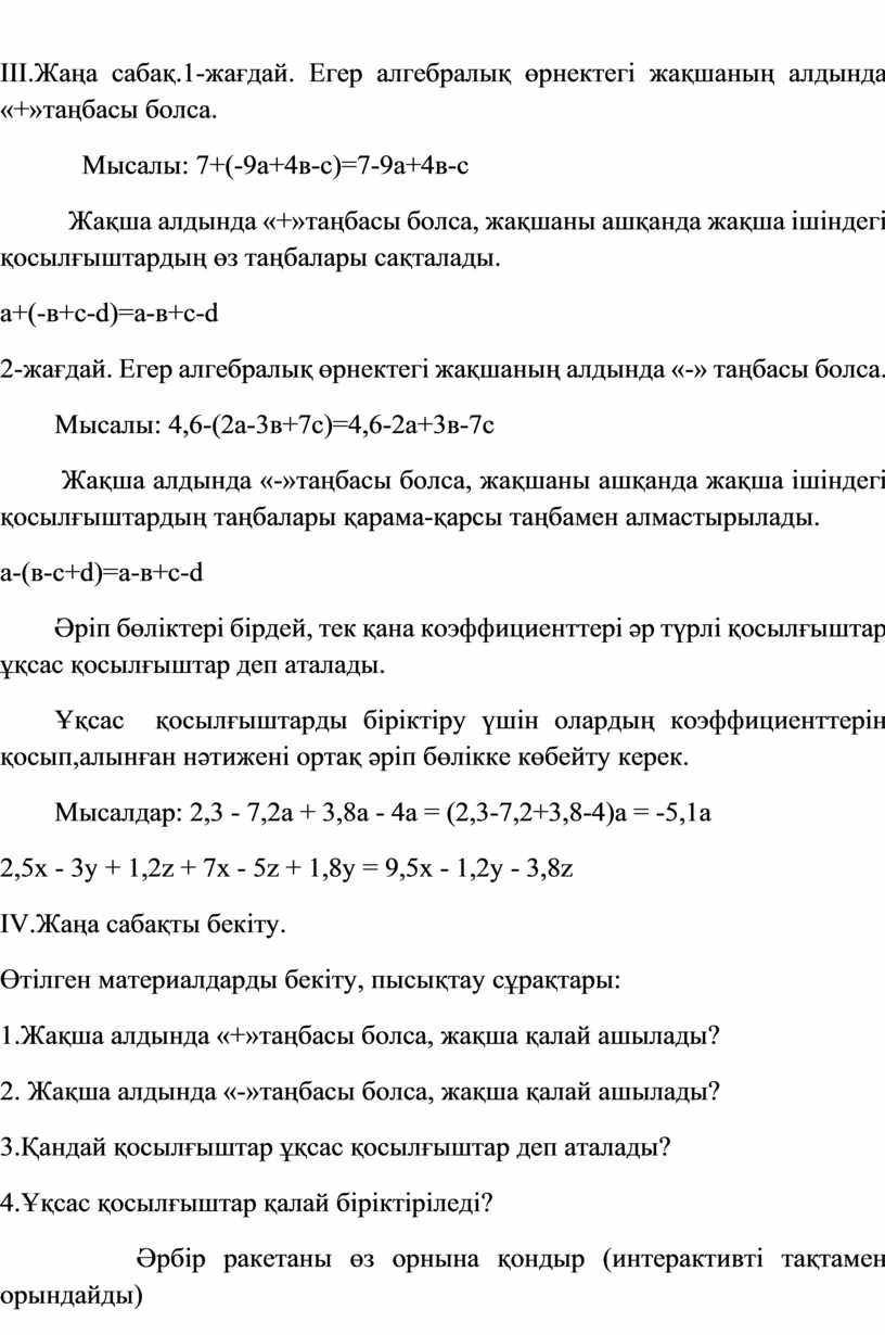 Сабақтың тақырыбы: Жақшаларды ашу. Ұқсас қосылғыштарды біріктіру.