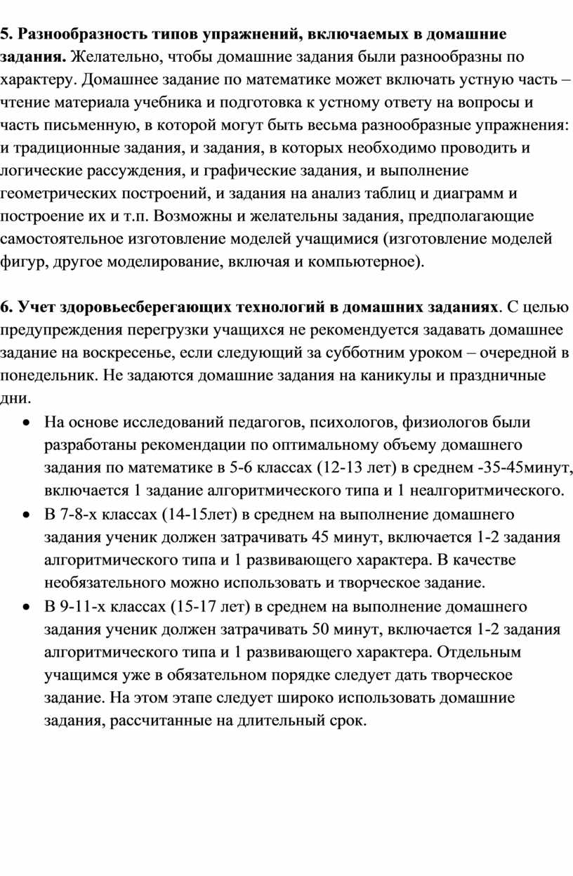 6. Учет здоровьесберегающих технологий в домашних заданиях. С целью предупреждения перегрузки учащихся не рекомендуется задавать домашнее задание на воскресенье, если следующий за субботним уроком – очередной в понедельник. Не задаются домашние задания на каникулы и праздничные дни.