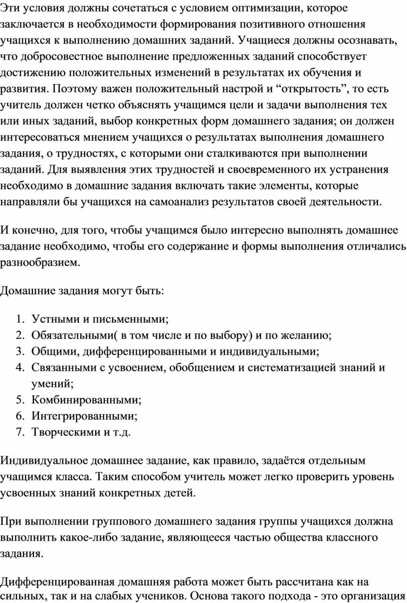 Для того чтобы добиться положительной динамики в развитии интеллектуальных и личностных качеств учащихся в результате выполнения домашних заданиях, необходимо чтобы формы домашнего задания и его содержание удовлетворяли определенным условиям.