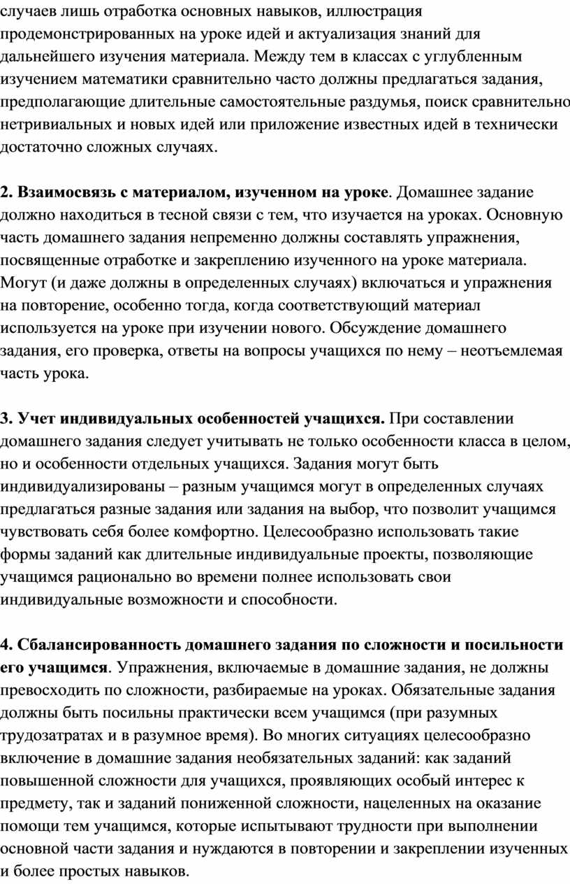 3. Учет индивидуальных особенностей учащихся. При составлении домашнего задания следует учитывать не только особенности класса в целом, но и особенности отдельных учащихся. Задания могут быть индивидуализированы – разным учащимся могут в определенных случаях предлагаться разные задания или задания на выбор, что позволит учащимся чувствовать себя более комфортно. Целесообразно использовать такие формы заданий как длительные индивидуальные проекты, позволяющие учащимся рационально во времени полнее использовать свои индивидуальные возможности и способности.