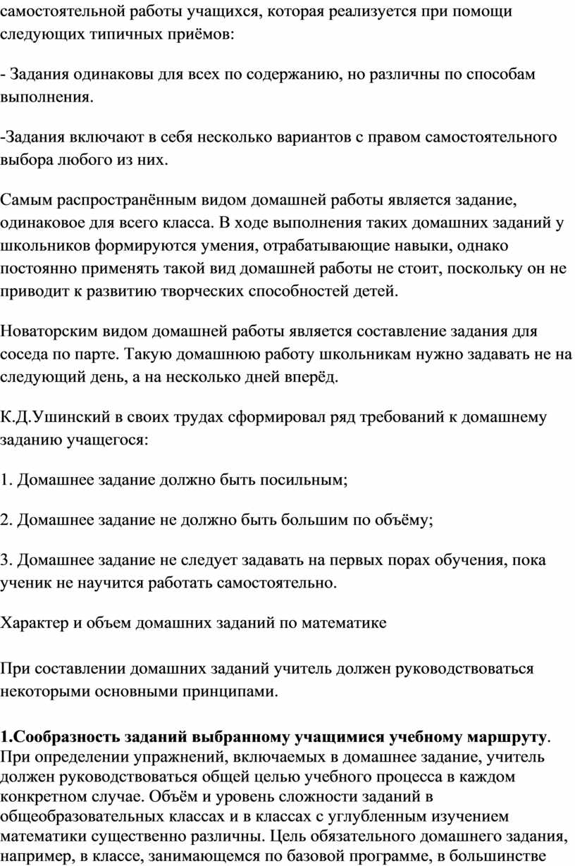 К.Д.Ушинский в своих трудах сформировал ряд требований к домашнему заданию учащегося: