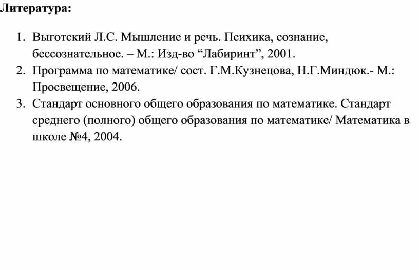 1. Выготский Л.С. Мышление и речь. Психика, сознание, бессознательное. – М.: Изд-во “Лабиринт”, 2001.