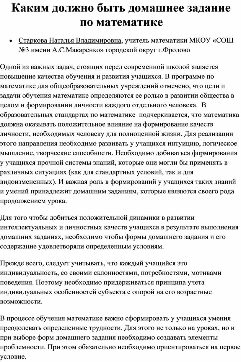 Одной из важных задач, стоящих перед современной школой является повышение качества обучения и развития учащихся. В программе по математике для общеобразовательных учреждений отмечено, что цели и задачи обучения математике определяются ее ролью в развитии общества в целом и формировании личности каждого отдельного человека. В образовательных стандартах по математике подчеркивается, что математика должна оказывать положительное влияние на формирование качеств личности, необходимых человеку для полноценной жизни. Для реализации этого направления необходимо развивать у учащихся интуицию, логическое мышление, творческие способности. Необходимо добиваться формирования у учащихся прочной системы знаний, которые они могли бы применять в различных ситуациях (как для стандартных условий, так и для видоизмененных). И важная роль в формирований у учащихся таких знаний и умений принадлежит домашним заданиям, которые являются своего рода продолжением урока.