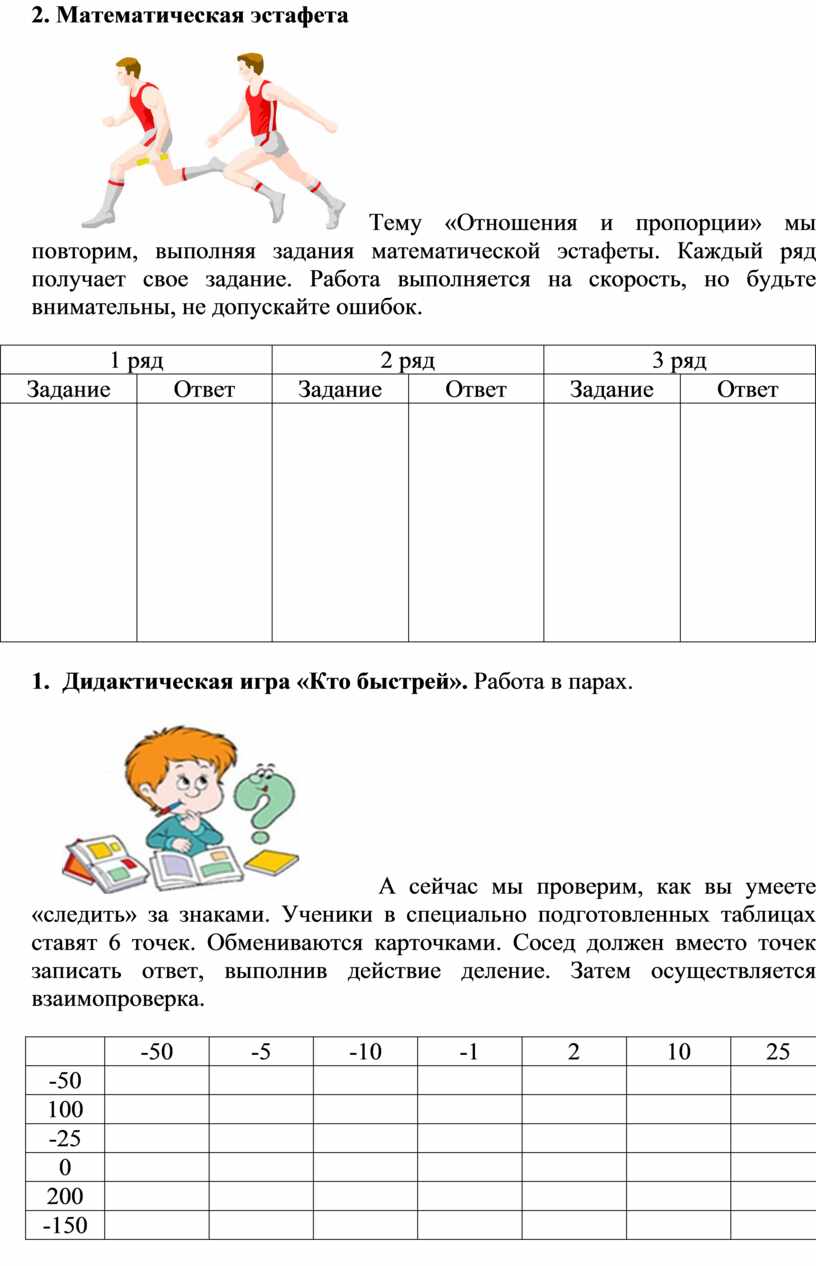 и пропорции» мы повторим, выполняя задания математической эстафеты. Каждый ряд
