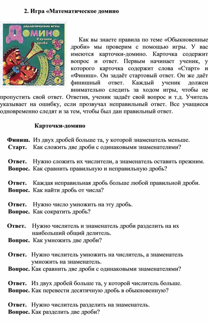 Как вы знаете правила по теме «Обыкновенные дроби» мы проверим с помощью игры. У вас имеются карточки-домино. Карточка содержит вопрос и ответ. Первым начинает ученик, у которого карточка содержит слова «Старт» и «Финиш». Он задаёт стартовый ответ. Он же даёт финишный ответ. Каждый ученик должен внимательно следить за ходом игры, чтобы не пропустить свой ответ. Ответив, ученик задаёт свой вопрос и т.д. Учитель указывает на ошибку, если прозвучал неправильный ответ. Все учащиеся одновременно следят и за тем, чтобы был дан правильный ответ.