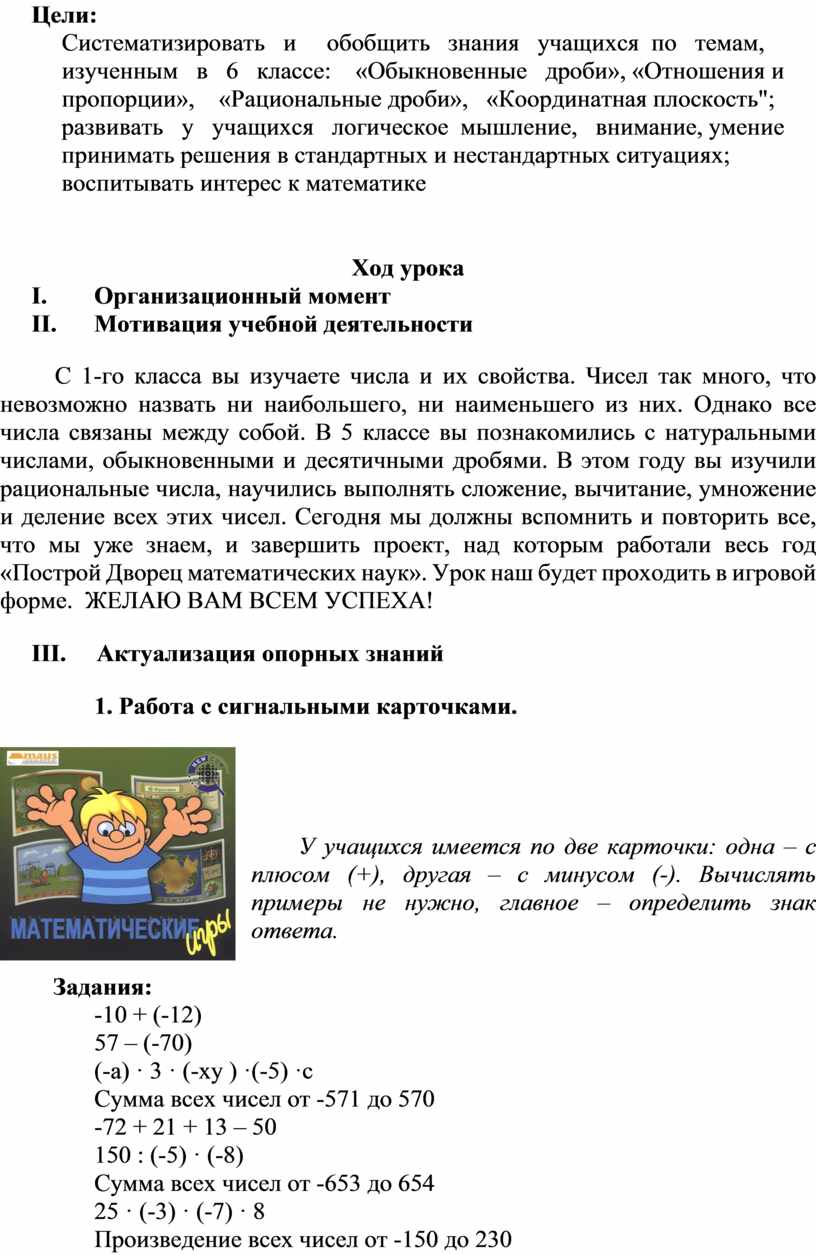С 1-го класса вы изучаете числа и их свойства. Чисел так много, что невозможно назвать ни наибольшего, ни наименьшего из них. Однако все числа связаны между собой. В 5 классе вы познакомились с натуральными числами, обыкновенными и десятичными дробями. В этом году вы изучили рациональные числа, научились выполнять сложение, вычитание, умножение и деление всех этих чисел. Сегодня мы должны вспомнить и повторить все, что мы уже знаем, и завершить проект, над которым работали весь год «Построй Дворец математических наук». Урок наш будет проходить в игровой форме. ЖЕЛАЮ ВАМ ВСЕМ УСПЕХА!