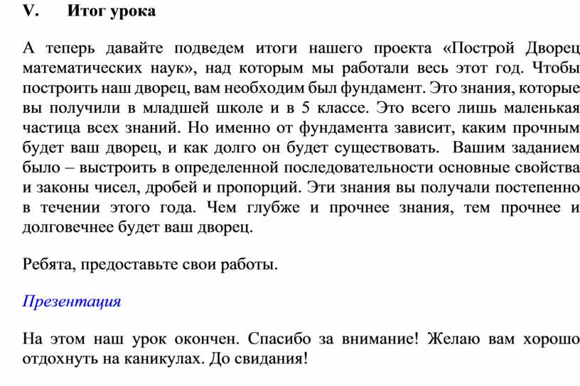 А теперь давайте подведем итоги нашего проекта «Построй Дворец математических наук», над которым мы работали весь этот год. Чтобы построить наш дворец, вам необходим был фундамент. Это знания, которые вы получили в младшей школе и в 5 классе. Это всего лишь маленькая частица всех знаний. Но именно от фундамента зависит, каким прочным будет ваш дворец, и как долго он будет существовать. Вашим заданием было – выстроить в определенной последовательности основные свойства и законы чисел, дробей и пропорций. Эти знания вы получали постепенно в течении этого года. Чем глубже и прочнее знания, тем прочнее и долговечнее будет ваш дворец.