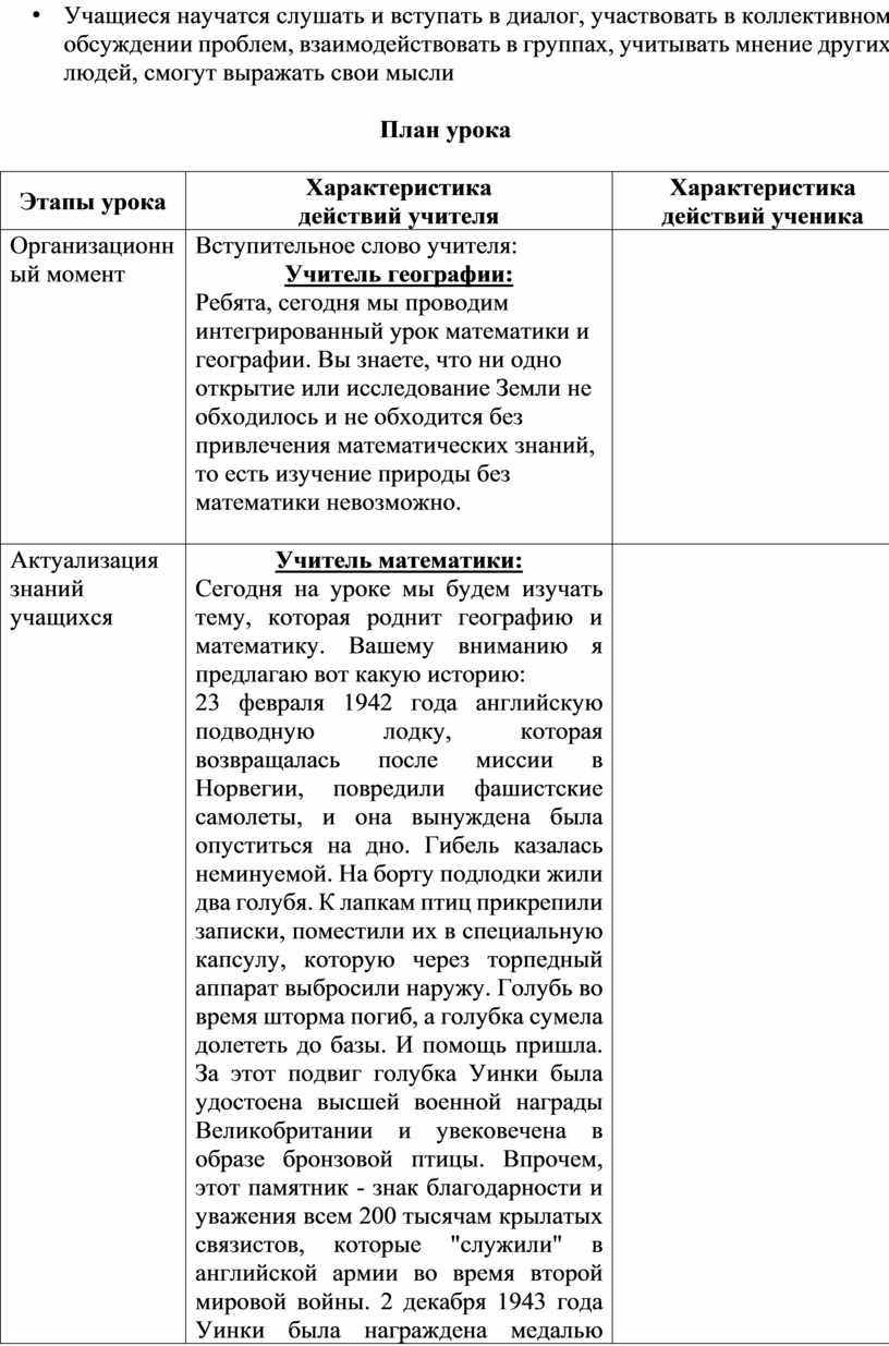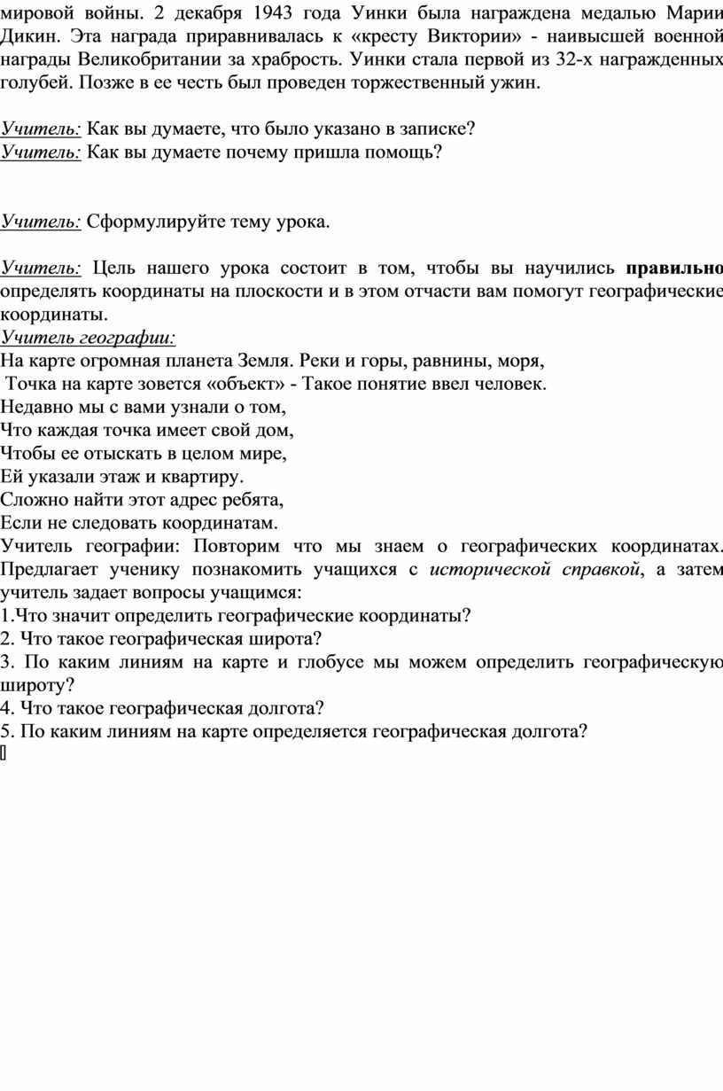 Учитель математики: Сегодня на уроке мы будем изучать тему, которая роднит географию и математику. Вашему вниманию я предлагаю вот какую историю: 23 февраля 1942 года английскую подводную лодку, которая возвращалась после миссии в Норвегии, повредили фашистские самолеты, и она вынуждена была опуститься на дно. Гибель казалась неминуемой. На борту подлодки жили два голубя. К лапкам птиц прикрепили записки, поместили их в специальную капсулу, которую через торпедный аппарат выбросили наружу. Голубь во время шторма погиб, а голубка сумела долететь до базы. И помощь пришла. За этот подвиг голубка Уинки была удостоена высшей военной награды Великобритании и увековечена в образе бронзовой птицы. Впрочем, этот памятник - знак благодарности и уважения всем 200 тысячам крылатых связистов, которые "служили" в английской армии во время второй мировой войны. 2 декабря 1943 года Уинки была награждена медалью Марии Дикин. Эта награда приравнивалась к «кресту Виктории» - наивысшей военной награды Великобритании за храбрость. Уинки стала первой из 32-х награжденных голубей. Позже в ее честь был проведен торжественный ужин.