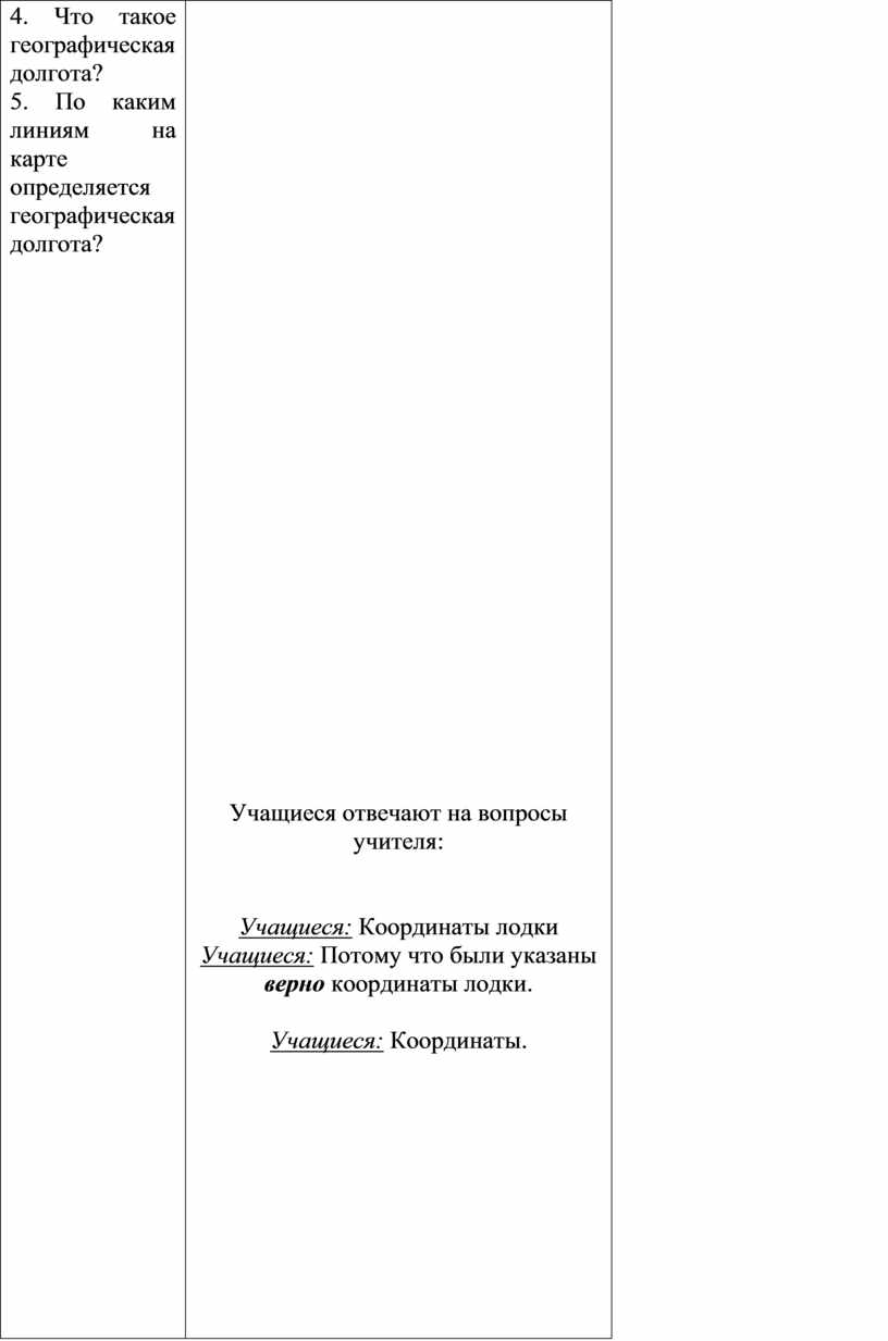 Учитель: Цель нашего урока состоит в том, чтобы вы научились правильно определять координаты на плоскости и в этом отчасти вам помогут географические координаты. Учитель географии: На карте огромная планета Земля. Реки и горы, равнины, моря, Точка на карте зовется «объект» - Такое понятие ввел человек. Недавно мы с вами узнали о том, Что каждая точка имеет свой дом, Чтобы ее отыскать в целом мире, Ей указали этаж и квартиру. Сложно найти этот адрес ребята, Если не следовать координатам. Учитель географии: Повторим что мы знаем о географических координатах. Предлагает ученику познакомить учащихся с исторической справкой, а затем учитель задает вопросы учащимся: 1.Что значит определить географические координаты? 2. Что такое географическая широта? 3. По каким линиям на карте и глобусе мы можем определить географическую широту? 4. Что такое географическая долгота? 5. По каким линиям на карте определяется географическая долгота?