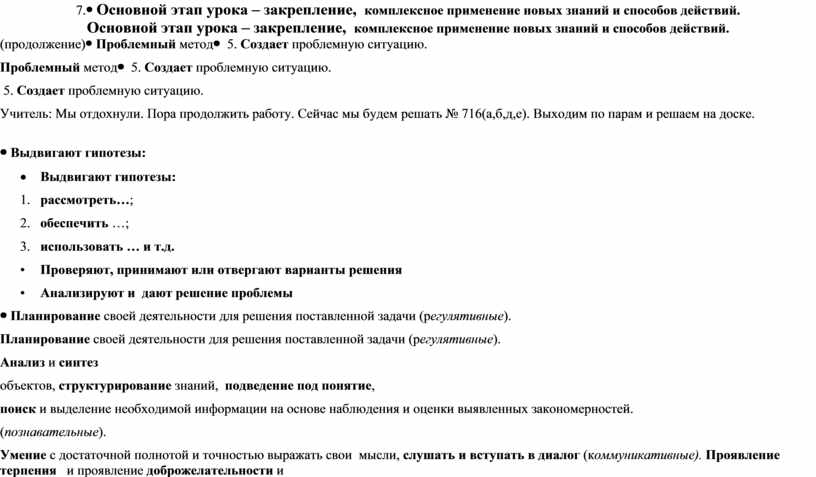 Планирование своей деятельности для решения поставленной задачи (регулятивные). Анализ и синтез объектов, структурирование знаний, подведение под понятие, поиск и выделение необходимой информации на основе наблюдения и оценки выявленных закономерностей. (познавательные). Умение с достаточной полнотой и точностью выражать свои мысли, слушать и вступать в диалог (коммуникативные). Проявление терпения и проявление доброжелательности и доверия к собеседнику, смыслообразование (личностные)