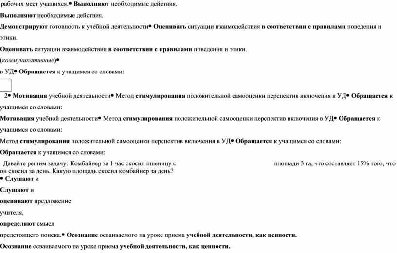Обращается к учащимся со словами: Давайте решим задачу: Комбайнер за 1 час скосил пшеницу с площади 3 га, что составляет 15% того, что он скосил за день. Какую площадь скосил комбайнер за день?