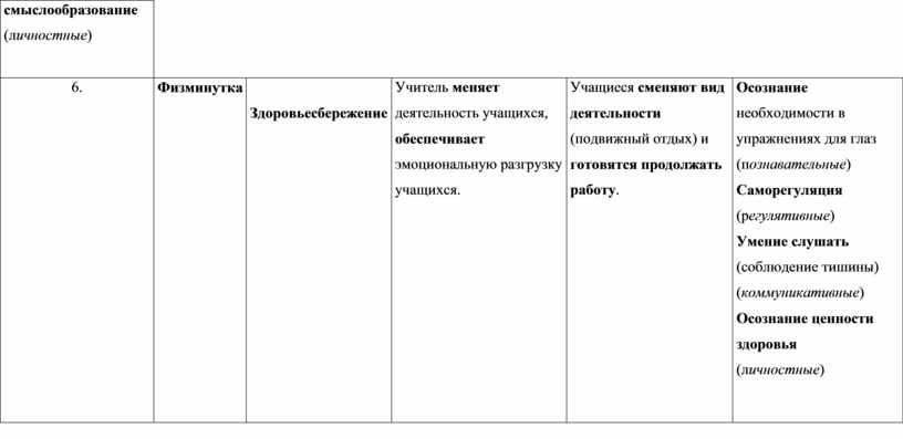 Осознание необходимости в упражнениях для глаз (познавательные) Саморегуляция (регулятивные) Умение слушать (соблюдение тишины) (коммуникативные) Осознание ценности здоровья (личностные) |