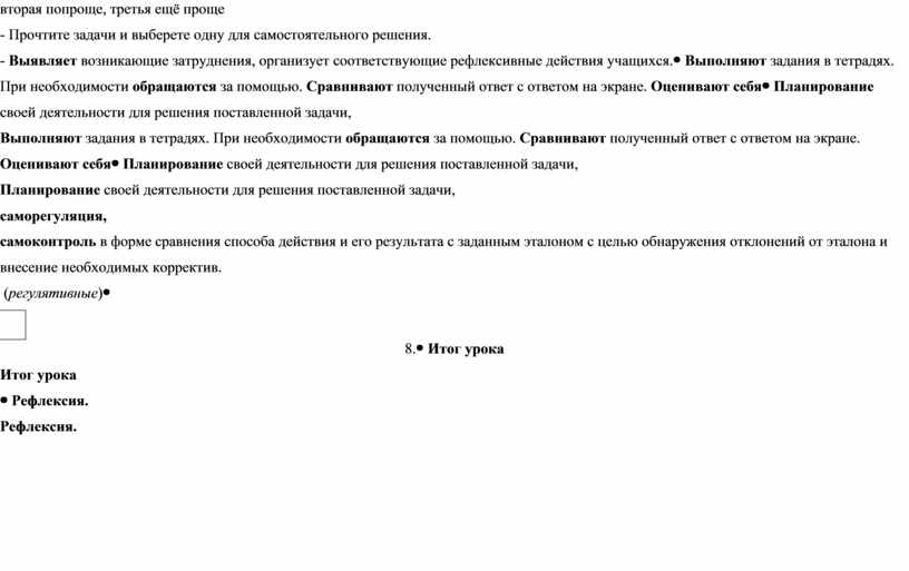 Планирование своей деятельности для решения поставленной задачи, саморегуляция, самоконтроль в форме сравнения способа действия и его результата с заданным эталоном с целью обнаружения отклонений от эталона и внесение необходимых корректив. (регулятивные) |