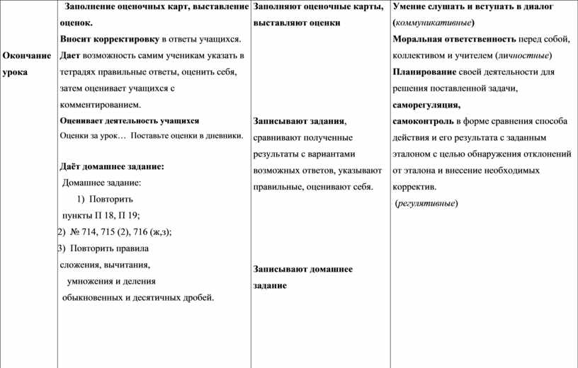Умение слушать и вступать в диалог (коммуникативные) Моральная ответственность перед собой, коллективом и учителем (личностные) Осознание осваиваемого на уроке приема учебной деятельности, как ценности. (личностные) |