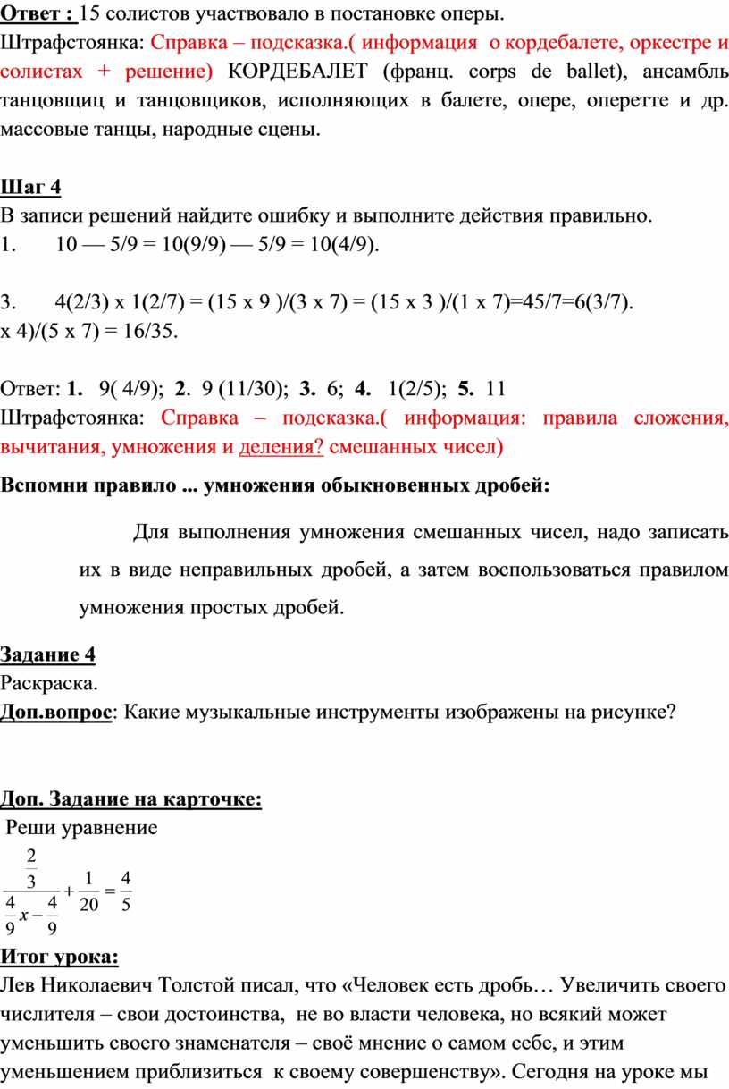 Лев Николаевич Толстой писал, что «Человек есть дробь… Увеличить своего числителя – свои достоинства, не во власти человека, но всякий может уменьшить своего знаменателя – своё мнение о самом себе, и этим уменьшением приблизиться к своему совершенству». Сегодня на уроке мы тоже приближались к совершенству, но к математическому, и закрепляли знания и умения по теме « Обыкновенные дроби» и « музыка». Без математики вместо музыкального произведения был бы набор звуков.