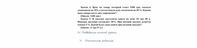 Задача 4. Цену на товар, который стоил 1500 грн, сначала уменьшили на 20%, а потом новую цену увеличили на 20 %. Какова цена товара после двух переоценок?