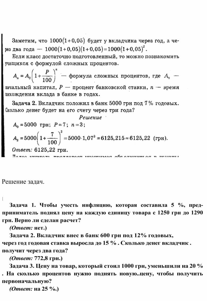 Задача 1. Вкладчик положил в банк 1000 грн под 5 % годовых. Сколько денег будет на его счету через 1 год, 2 года?