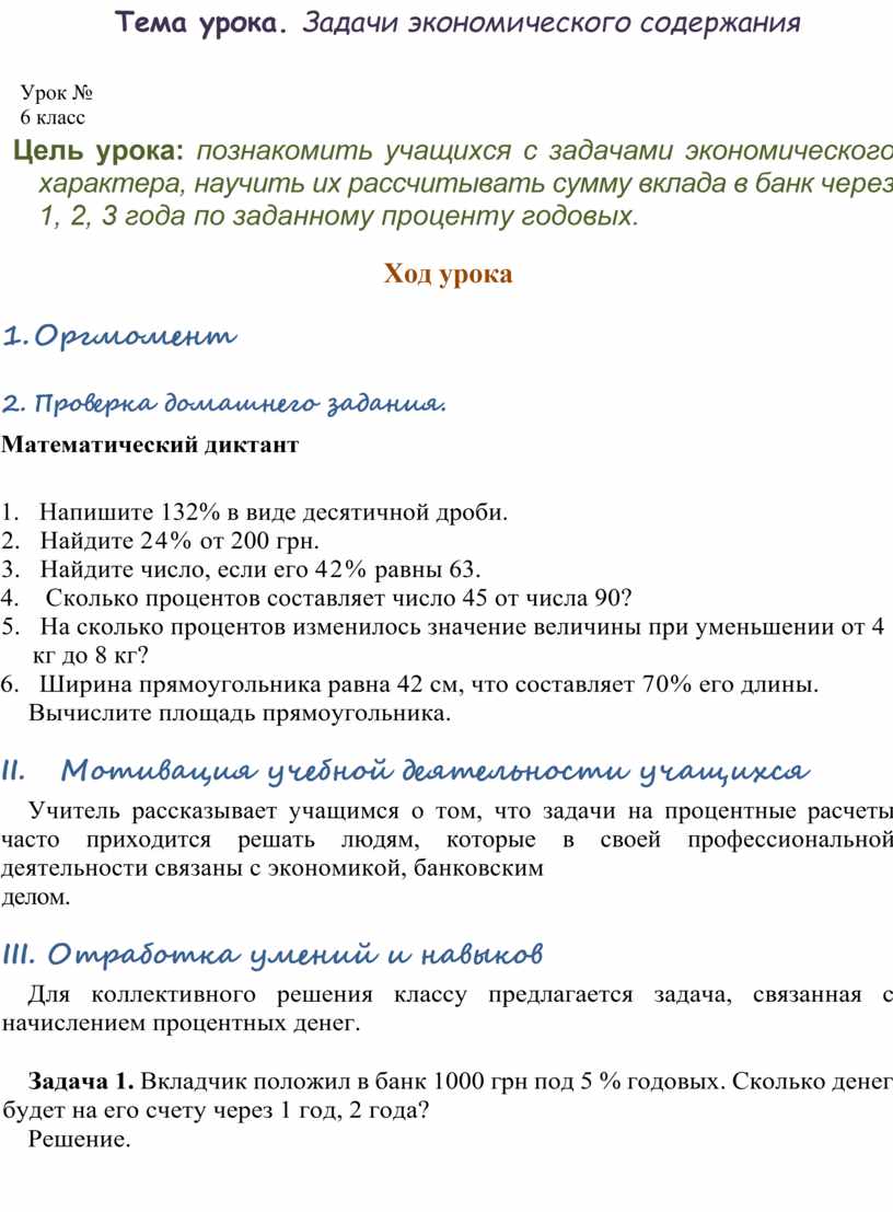 Цель урока: познакомить учащихся с задачами экономического характера, научить их рассчитывать сумму вклада в банк через 1, 2, 3 года по заданному проценту годовых.