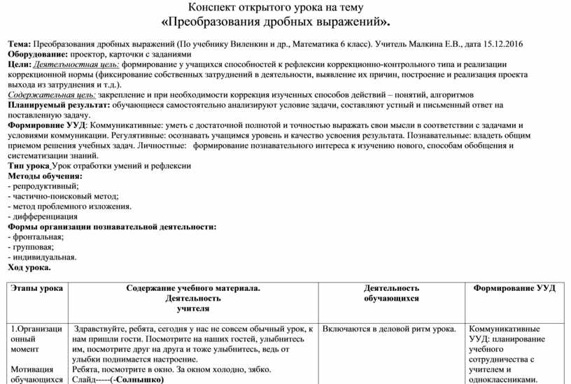 Тема: Преобразования дробных выражений (По учебнику Виленкин и др., Математика 6 класс). Учитель Малкина Е.В., дата 15.12.2016
