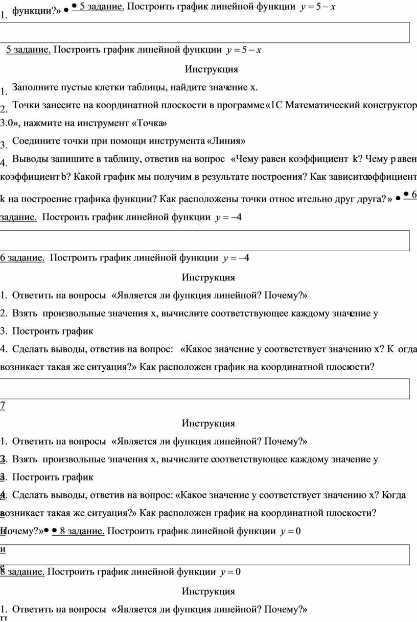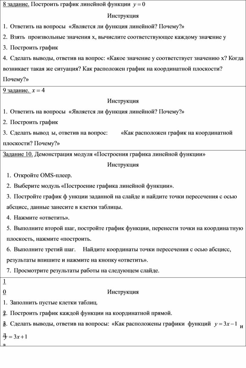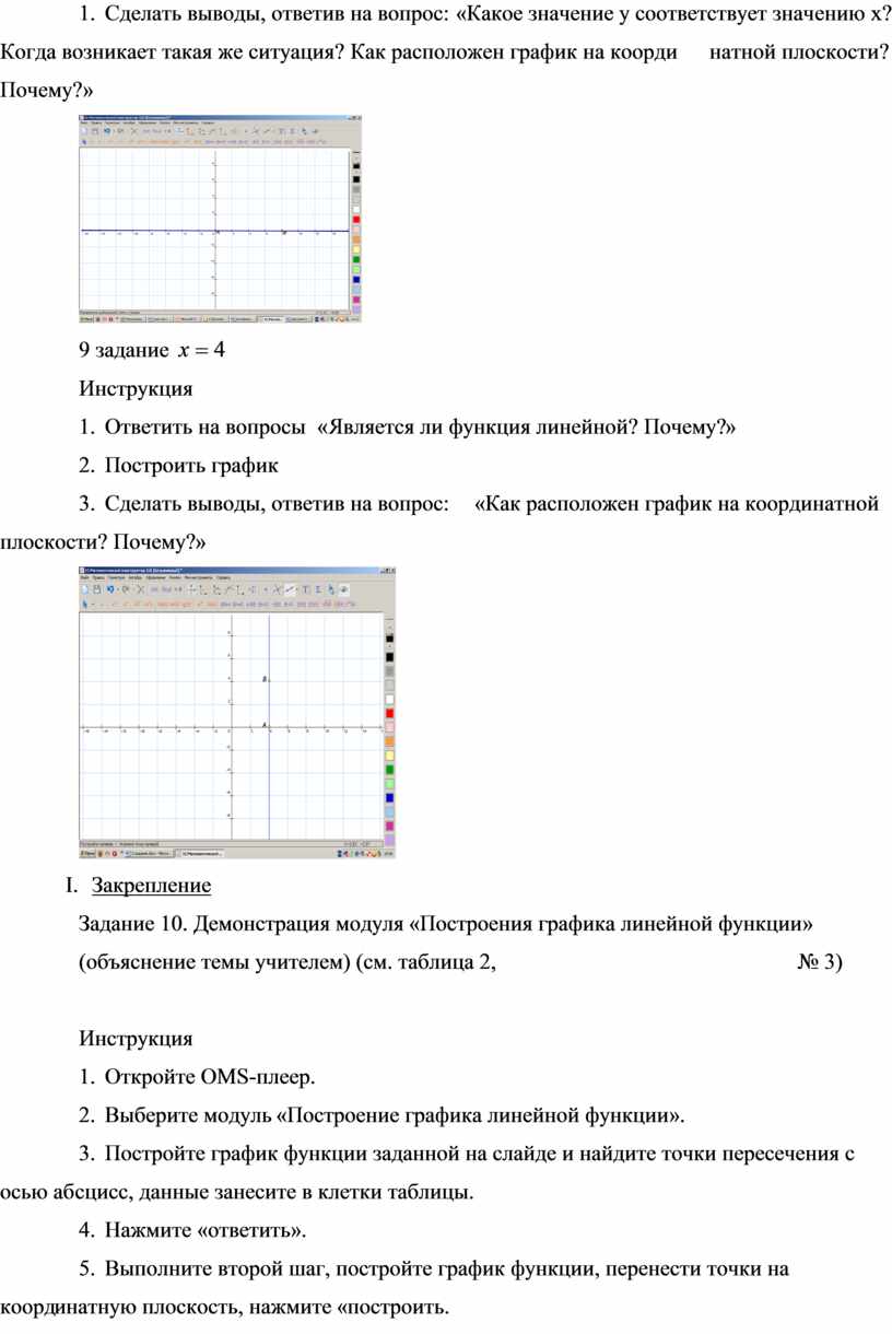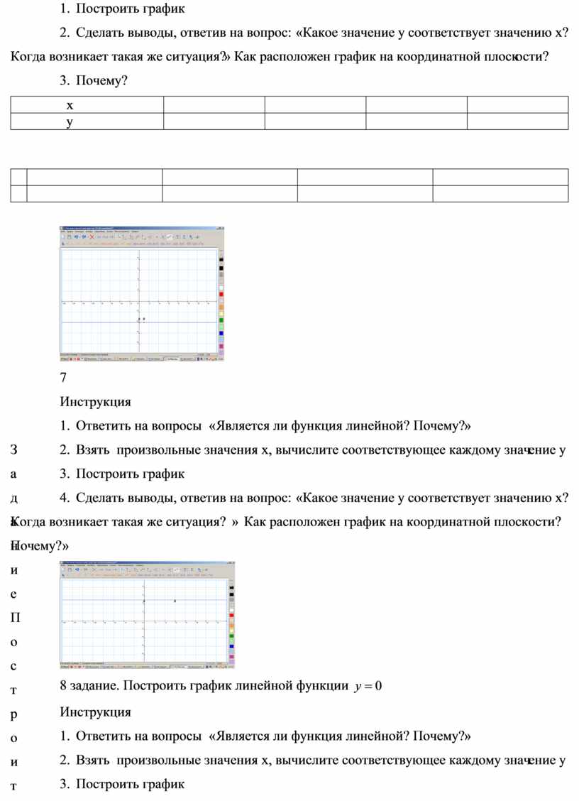 8 задание. Построить график линейной функции Инструкция 1. Ответить на вопросы «Является ли функция линейной? Почему?» 2. Взять произвольные значения х, вычислите соответствующее каждому значение у 3. Построить график 4. Сделать выводы, ответив на вопрос: «Какое значение у соответствует значению х? Когда возникает такая же ситуация? Как расположен график на координатной плоскости? Почему?» |