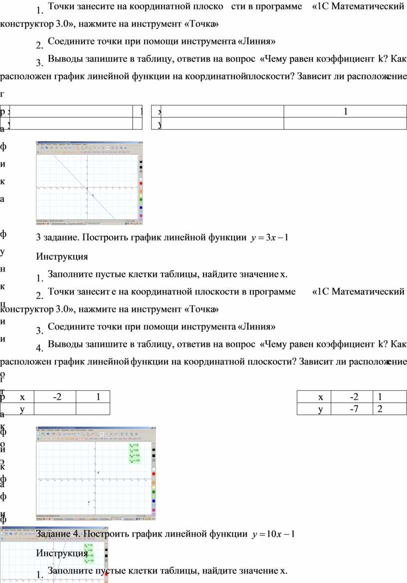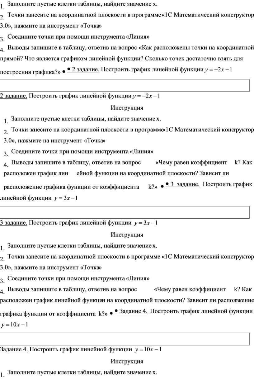 2 задание. Построить график линейной функции Инструкция 1. Заполните пустые клетки таблицы, найдите значение x. 2. Точки занесите на координатной плоскости в программе «1С Математический конструктор 3.0», нажмите на инструмент «Точка» 3. Соедините точки при помощи инструмента «Линия» 4. Выводы запишите в таблицу, ответив на вопрос «Чему равен коэффициент k? Как расположен график линейной функции на координатной плоскости? Зависит ли расположение графика функции от коэффициента k?» |