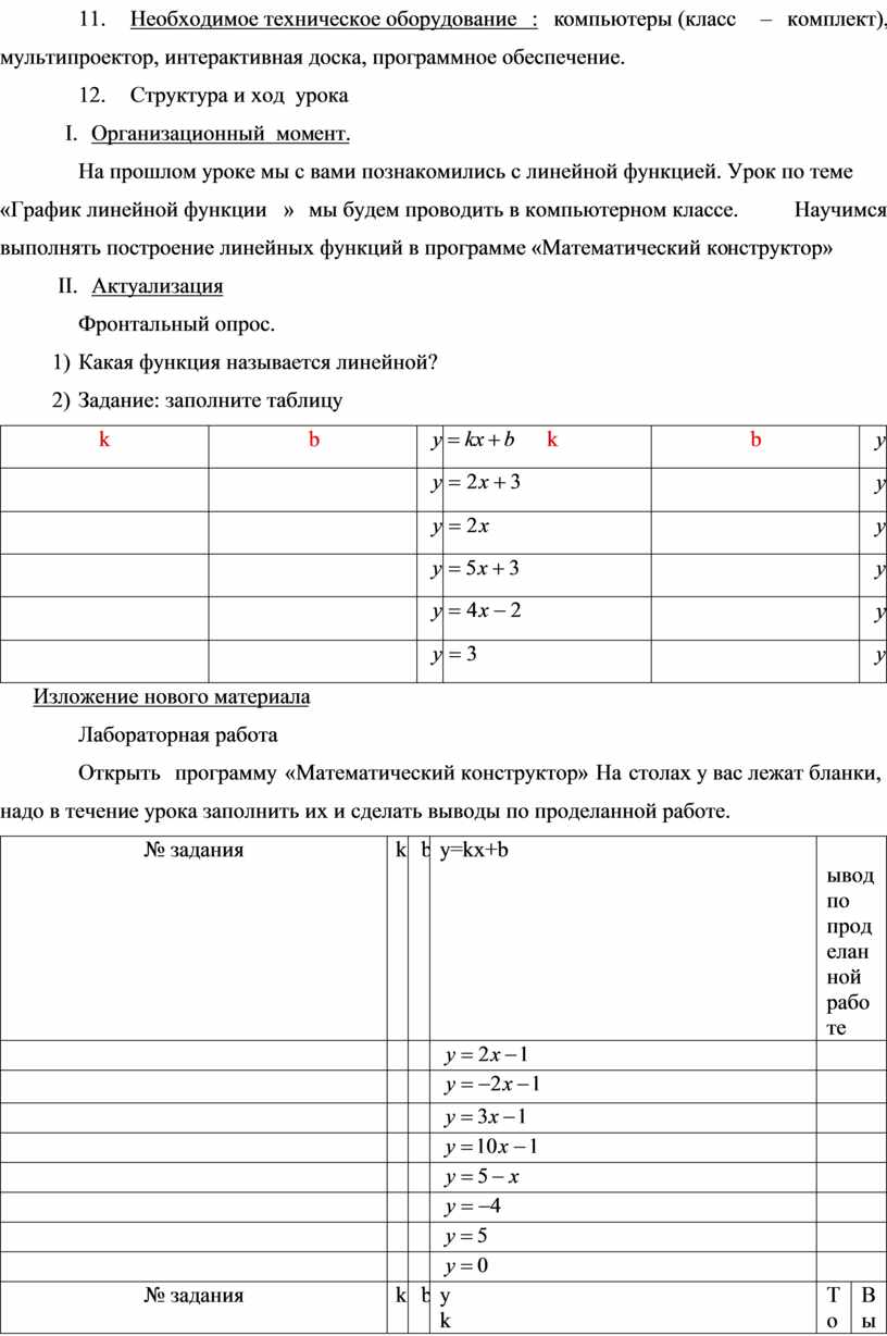 график линейной функции Инструкция 1. Заполните пустые клетки таблицы, найдите значение x. 2. Точки занесите на координатной плоскости в программе «1С Математический конструктор 3.0», нажмите на инструмент «Точка» 3. Соедините точки при помощи инструмента «Линия» 4. Выводы запишите в таблицу, ответив на вопрос «Чему равен коэффициент k? Чему равен коэффициент b? Какой график мы получим в результате построения? Как зависит коэффициент k на построение графика функции? Как расположены точки относительно друг друга?» |