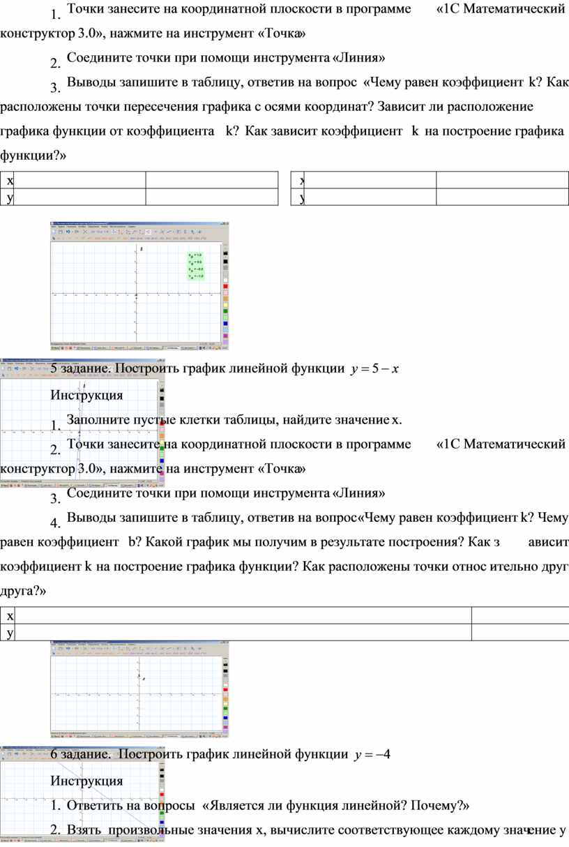 график линейной функции Инструкция 1. Заполните пустые клетки таблицы, найдите значение x. 2. Точки занесите на координатной плоскости в программе «1С Математический конструктор 3.0», нажмите на инструмент «Точка» 3. Соедините точки при помощи инструмента «Линия» 4. Выводы запишите в таблицу, ответив на вопрос «Чему равен коэффициент k? Как расположены точки пересечения графика с осями координат? Зависит ли расположение графика функции от коэффициента k? Как зависит коэффициент k на построение графика функции?» |